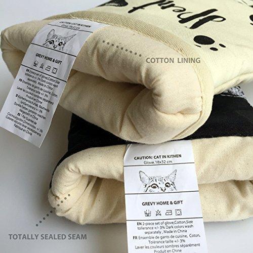 Cotton Imported Big,but NOT HUGE,fits most average hands, Flexible enough so that it doesn't restrict any motion.you can effectively grasp pans because it is all bunched at the end.grip the edge of a baking pan to take it out,grabbing the handles of the cookware,holding a lid…Not difficult any more. Long,but NOT Awkward,as a cooking glove 12” is long enough to protects the arms from accidental spillage.allows you to reach deeper into the oven to grab, Also good for grabbing full sheets in the middle and the large sheet won't accidentally burn your arms. Machine washing.Easy care.each cooking glove has a “cat‘s paw" loop for you to hang the oven mitt up on a hook. Lining,the inside of the oven mitts is very soft cotton fabric,with a warm and nice touch, feel very comfortable and they do protect your hands.And it's so easy to get your hands in and out.you could just relax and enjoy the baking time. Cute,for home and everyday kitchen use.They are the perfect gift for anyone who likes to bake.or a Ideal Birthday Gifts, Even they are Hanging on the wall,they look just Tastefully Artsy Attractive. your family member or friends will be sure to love them.