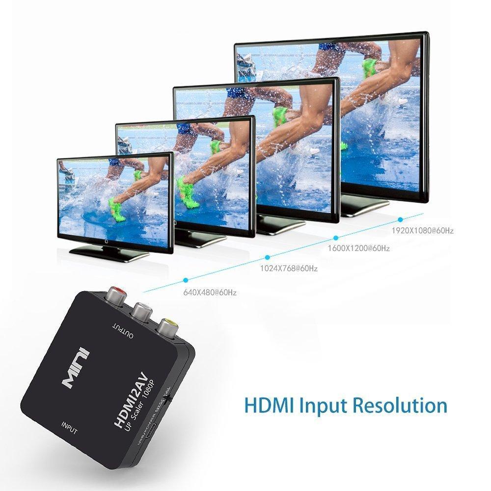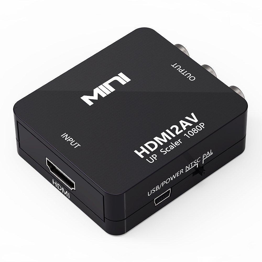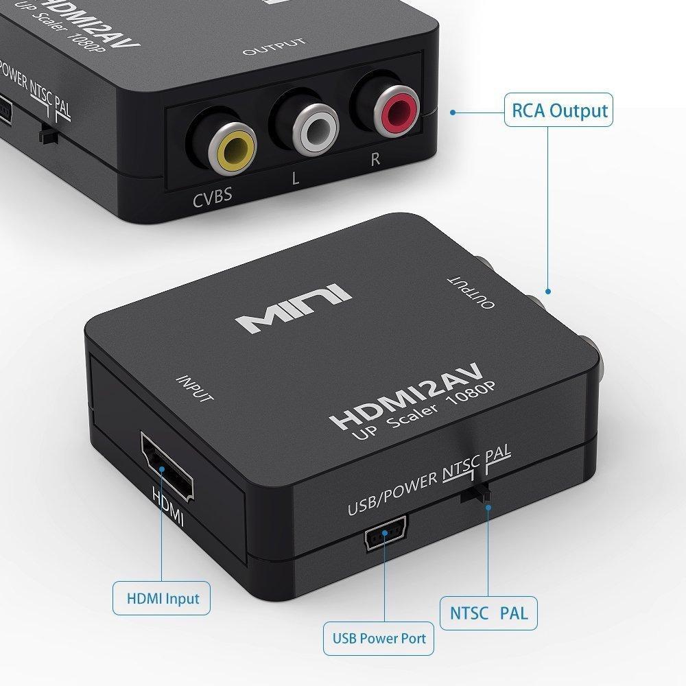 【HDMI to AV】Please Note: 1. This converter does NOT support 3D; 2. HDMI to RCA only, cannot be used as a RCA to HDMI converter; 3. Please connect the power cable (included) to get this converter working perfectly. 【Great Transmission】Latest video processing and scaler video processing technologies, ultimate clear output CVBS makes better picture's brightness / contrast ratio / color and high-definition of HDMI signal after scaler down into CVBS output. 【Plug and Play】No need to install drivers, convert high-quality HDMI video signal to normal CVBS(AV) signal (standard-definition 480i, 576i), available for TV, VHS VCR, DVD recorders, etc. 【Mini Size】Very little HDMI to RCA converter box, portable and flexible, work like a charm as an adapter that supports NTSC and PAL two standard TV formats. 【Your Satisfaction Guaranteed】12 Months Warranty, 30 Days Money Back Policy- make sure you spend your money with ZERO risk.