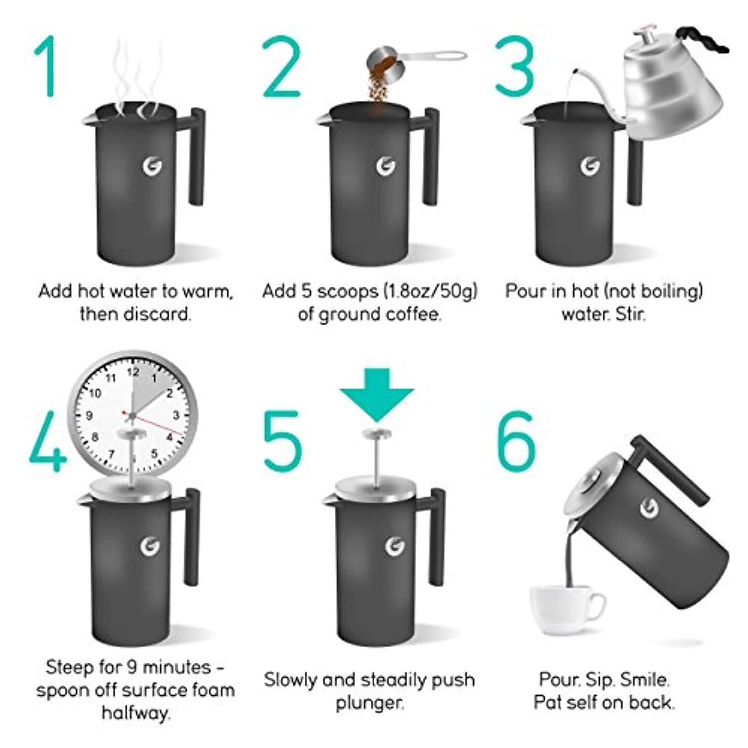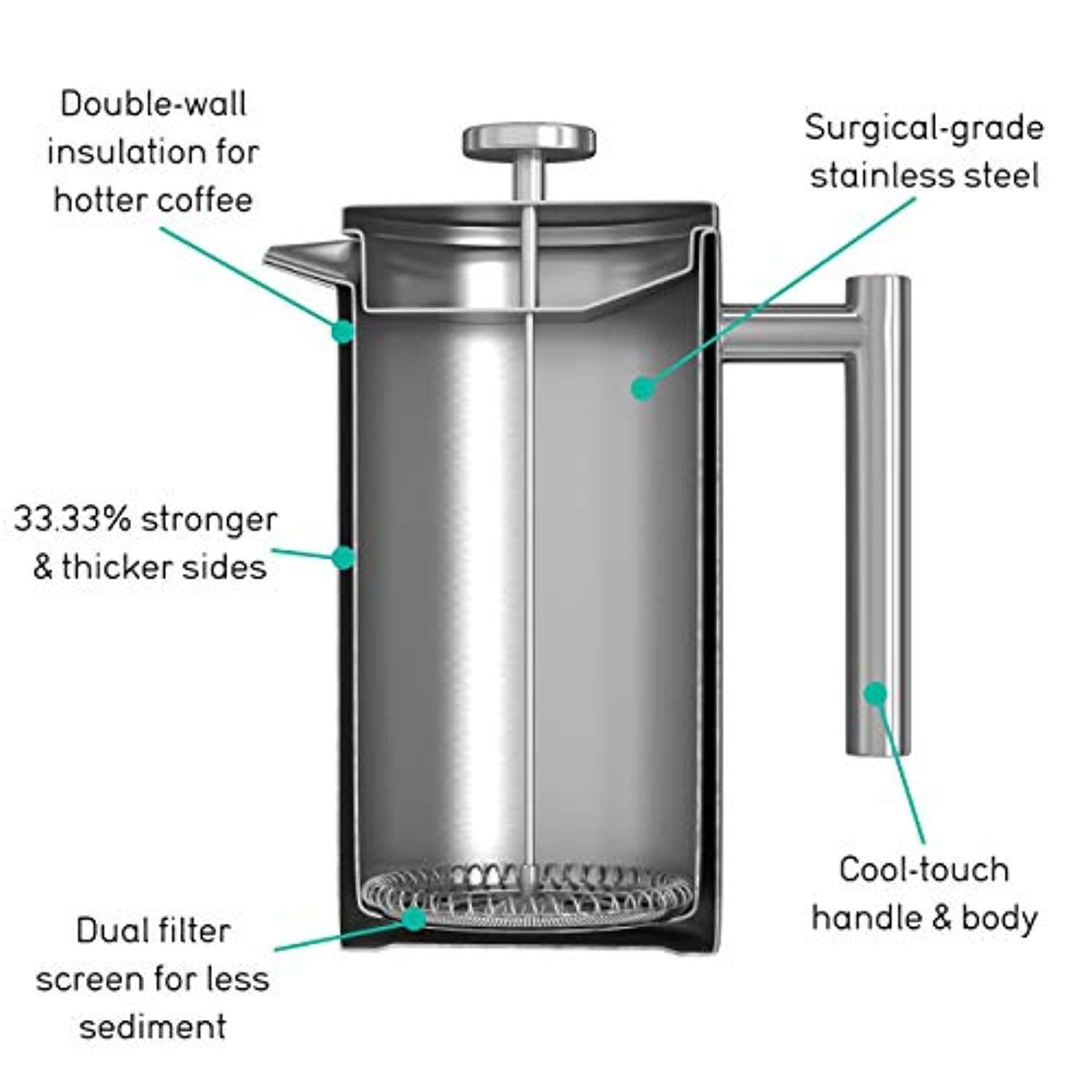 Large French Press Coffee Maker – Vacuum Insulated Stainless Steel (Gray, 34floz)
