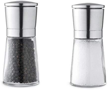 Timeless Glass and Stainless Steel Design Fully Adjustable Mills from Course to Fine Grind Salt Mill Comes Pre-Filled with Salt Crystals Pepper Mill Comes Pre-Filled with Black Peppercorns Lifetime Guarantee from the Manufacturer